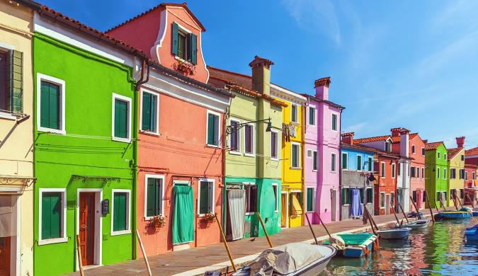 Renk Hikayesi: Venedik’in hemen dışındaki bu balıkçı adası, koyu maviler, canlı sarılar, parlak pembeler ve turuncularla adeta bir fırça darbesi. Rivayete göre balıkçılar, sisli havalarda evlerini denizden ayırt edebilmek ve aidiyet duygusuyla bu parlak renklere boyamış. Renkler, adanın kimliğinin ayrılmaz bir parçası haline gelmiş.